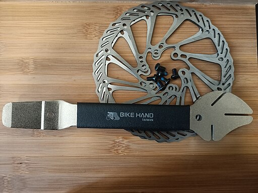 - Use a rotor truing tool (or an adjustable spanner wrapped in a cloth) to gently bend the rotor back into alignment.